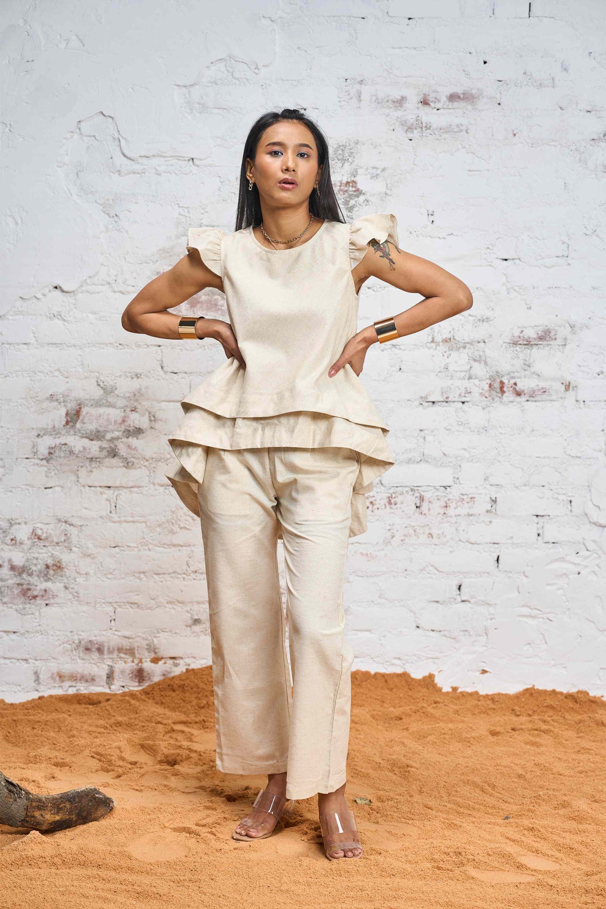 For long lunches, running errands or spontaneous coffee outings, the Aquaba Co-ord set is the perfect choice. Designed with a frilly sleeve, this set is made from 100% Khadi fabric, making it the ideal and an effortless choice for breezy summer days.